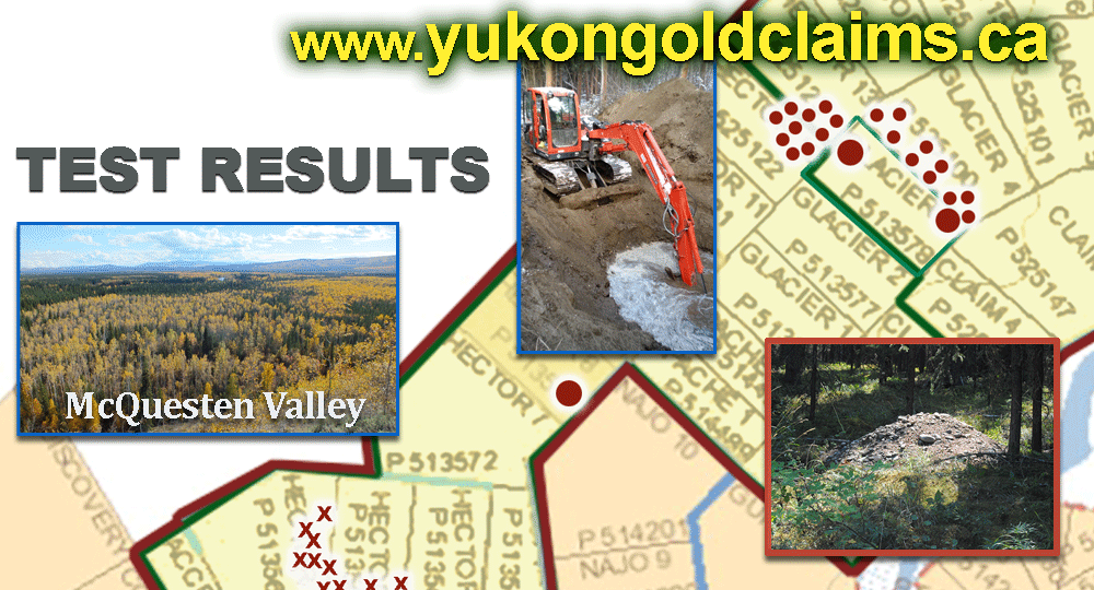 Test results have been consistent across all our McQuesten claims, averaging 0.4 grams per cubic meter (0.406 grams per yard), lighter at the top beneath the overburden, then quickly increasing as you dig down.